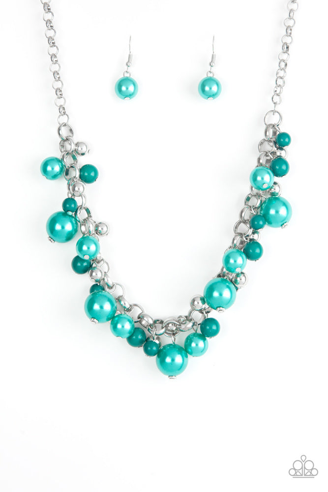 Varying in size, bubbly green pearls, classic silver beads, and shiny green beads swing from the bottom of a glistening silver chain, creating a refined fringe below the collar. Features an adjustable clasp closure.