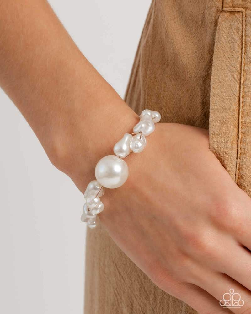 Infused along a trio of dainty copper wires, a collection of classic and baroque white pearls in varying sizes coalesce around the collar, leading the eye to an oversized round white pearl for an opulent, refined display. Features an adjustable clasp closure. Infused along a trio of dainty copper wires, a collection of classic and baroque white pearls in varying sizes coalesce around the wrist, leading the eye to an oversized round white pearl for an opulent, refined centerpiece. Features an adjustable clasp closure.
